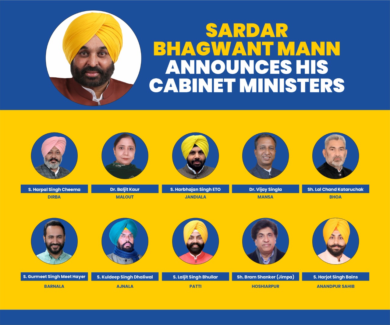 Chandigarh: Aam Aadmi Party (AAP) chief minister Bhagwant Mann on Friday announced the list of 10 MLAs to be inducted as Cabinet minister in the state on Saturday.