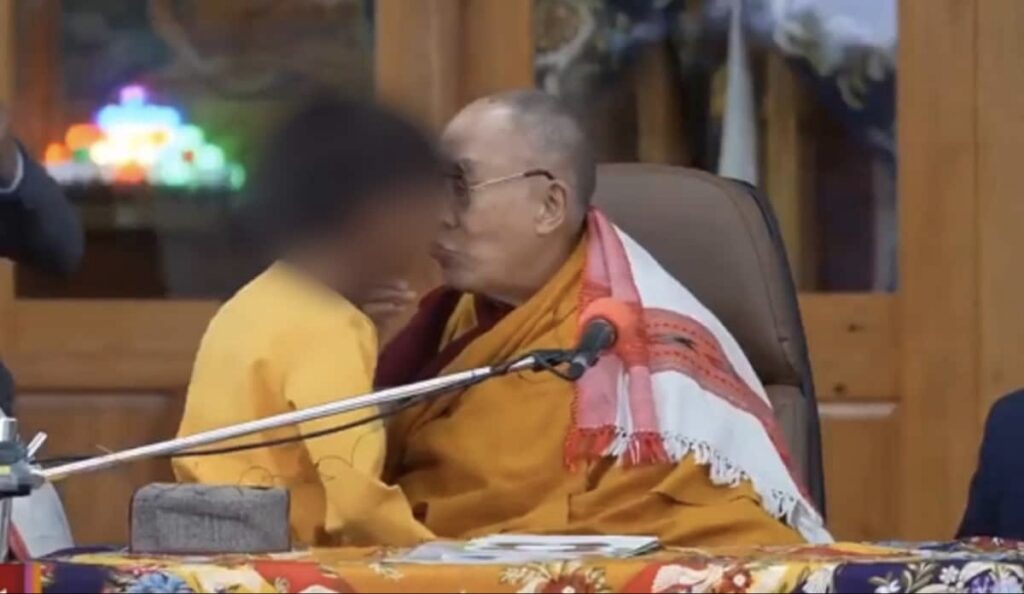 A video of the Dalai Lama kissing a child’s lips and then asking him to “suck his tongue” has sparked a controversy.