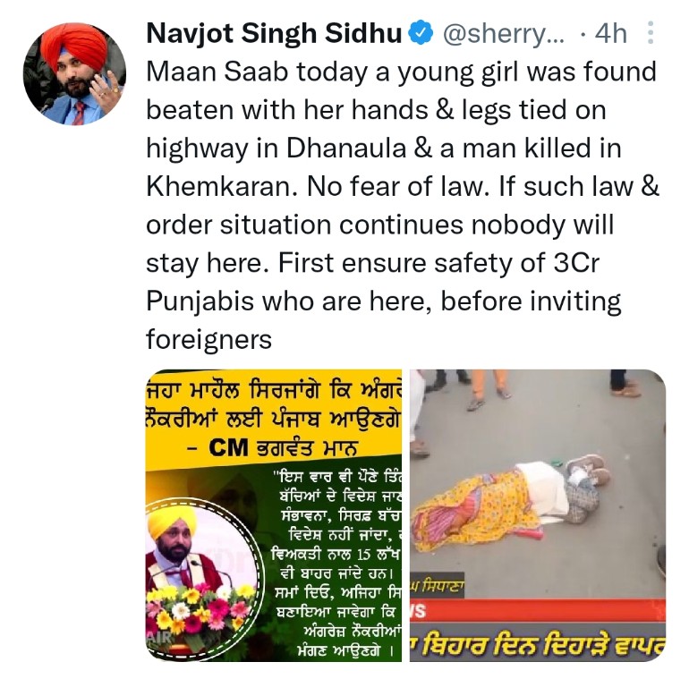 “Maan Saab today a young girl was found beaten with her hands & legs tied on highway in Dhanaula & a man killed in Khemkaran. No fear of law. If such law & order situation continues nobody will stay here. First ensure safety of 3Cr Punjabis who are here, before inviting foreigners,” Sidhu said.