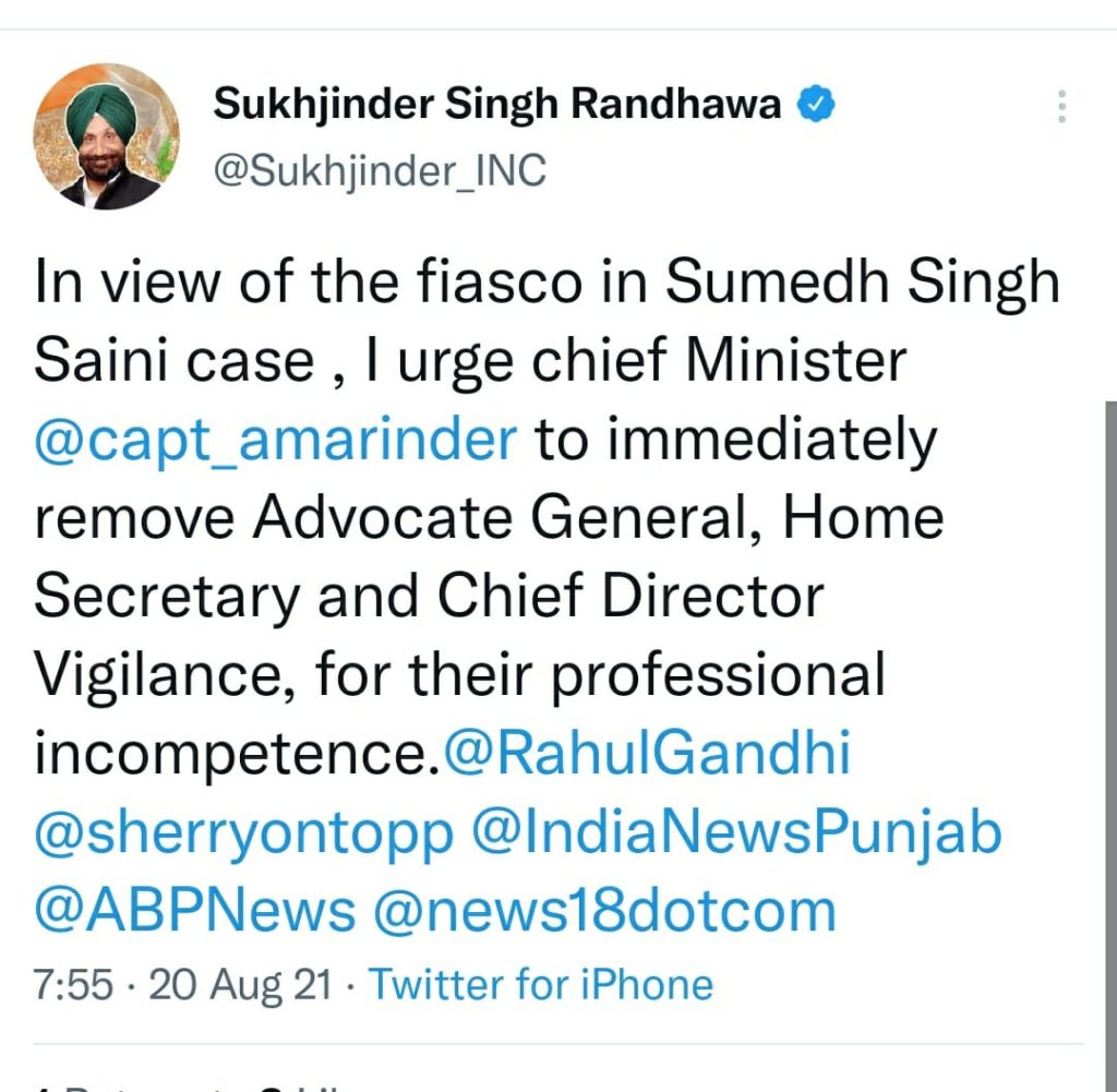 Chandigarh: Hours after the Punjab and Haryana High ordered the immediate release of former DGP Sumedh Singh Saini, Punjab Cabinet Minister Sukhjinder Singh Randhawa on Friday demanded the removal of three top officers of the government blaming them for the failure in this case.