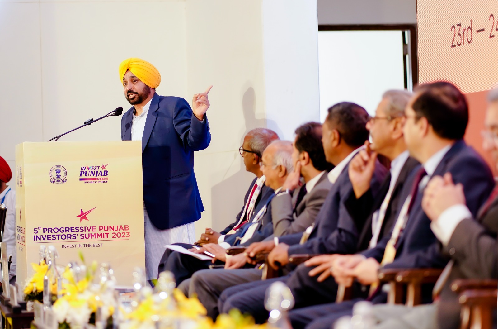 The Chief Minister, while addressing the Bussiness tycoons here during the inaugural session of the fifth Progressive Punjab Investors Summit, welcomed them to land of saints, seers and martyrs adding that he was elated to have eminent personalities amongst us today. He said that Punjab is most favourable investment destination across the country and no stone will be left unturned to facilitate them. Bhagwant Mann envisioned a strong association between the state government and industrialists to make Punjab an industrial hub in the country.