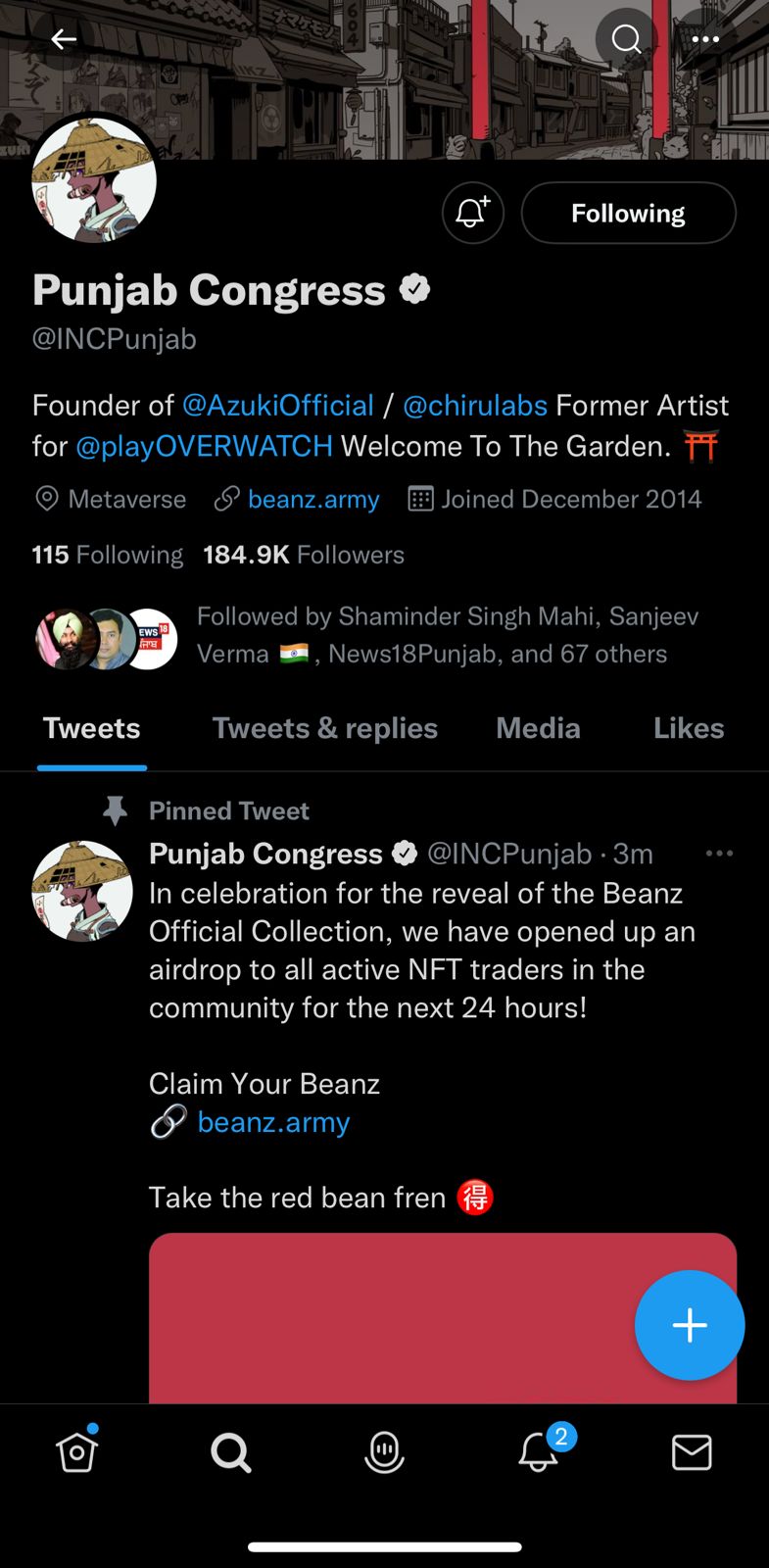 The state government’s handle, which has over 184 thousand followers. A post that was pinned – with a GIF image – read, “In celebration for the reveal of the Beanz Official Collection, we have opened up an airdrop to all active NFT traders in the community for the next 24 hours!.”